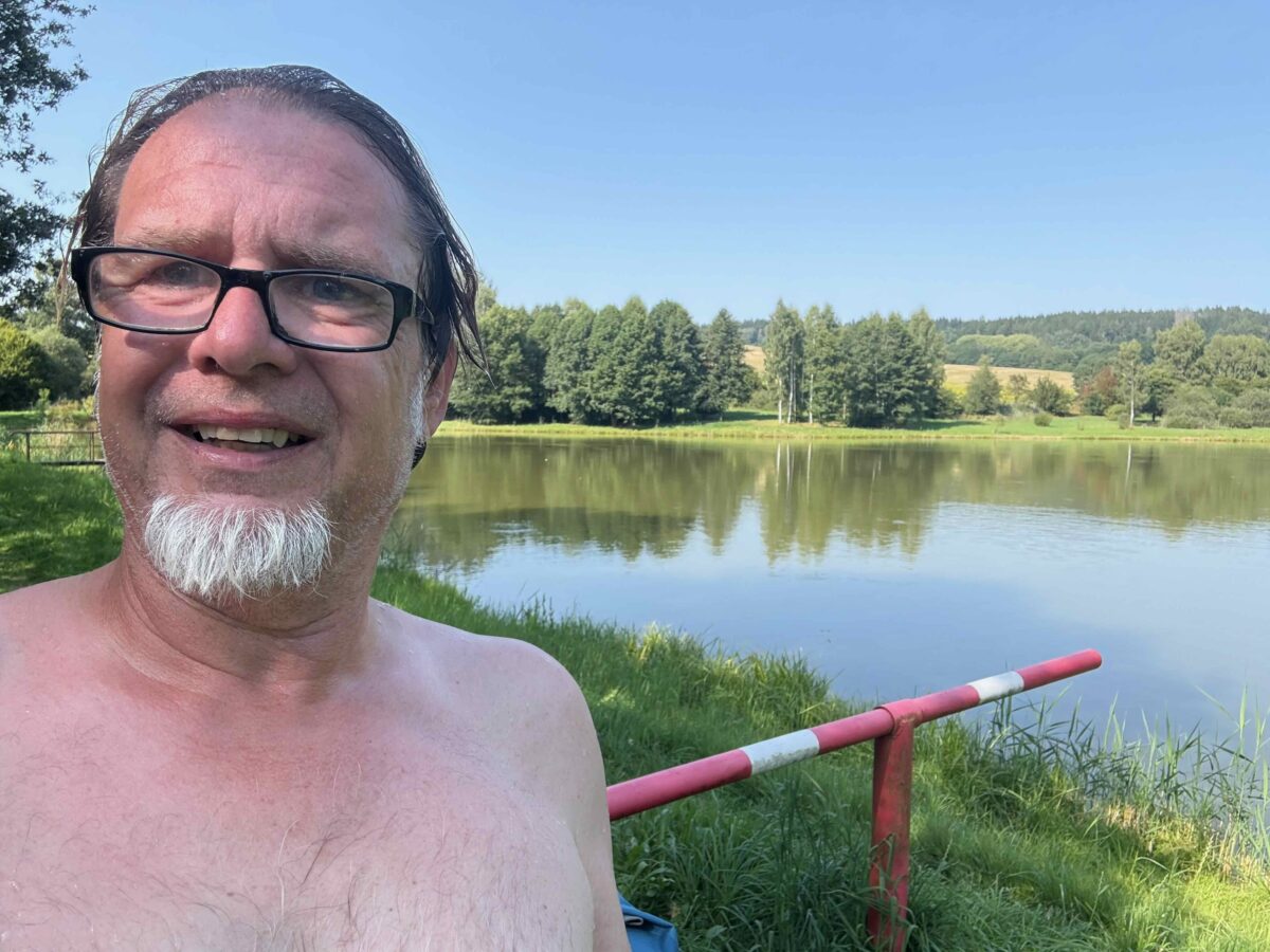 Irgendwann querte ich die Tschechische Grenze und fuhr einen kleinen Zipfel durch dieses Wunderschöne Land und Wald. Alles grün und entspannter. Passte zum Tag und so landete ich irgendwann an einem kleinen künstlichen See mitten im Wald und dachte: Nutze die Entspanntheit! Nutze sie! Geh baden! Und so tat ich das auch. Sven beim Radfahren so entspannt das er ne Pause macht und auch noch baden geht! Wie unefizient ; -) Es war toll, wenn auch nur von kurzer Dauer! Aber ich sprach mit ein paar Fischen und entschuldige mich auch bei denen – ich denke mal das war deren Teich ; -)