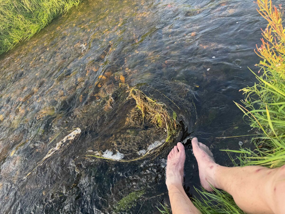 Ich werkelte so noch ein bisschen mit Blick auf die Schafe, lies meinen Tagesspaziergang sein und verkrümelte mich irgendwann mit den Füssen in den Bach und genoss das fliessende Wasser dort.