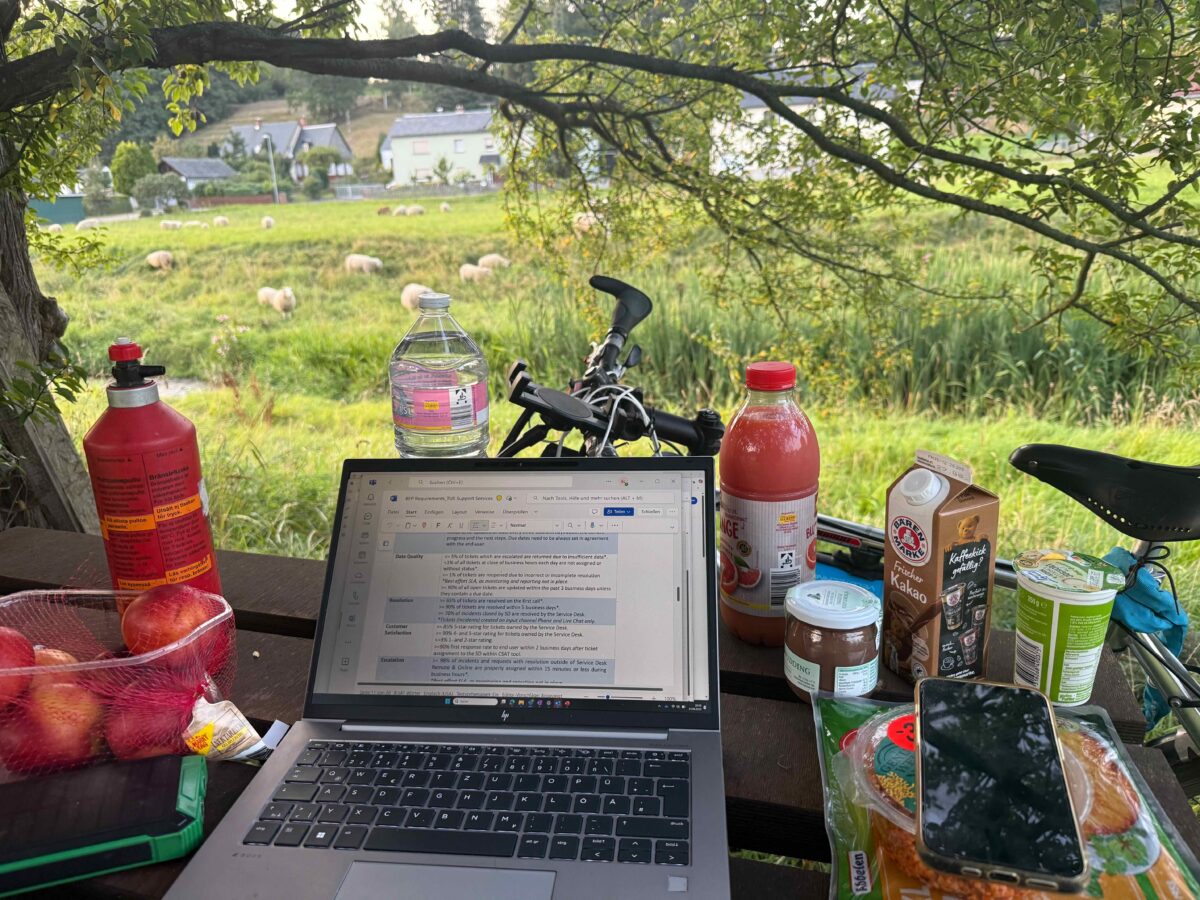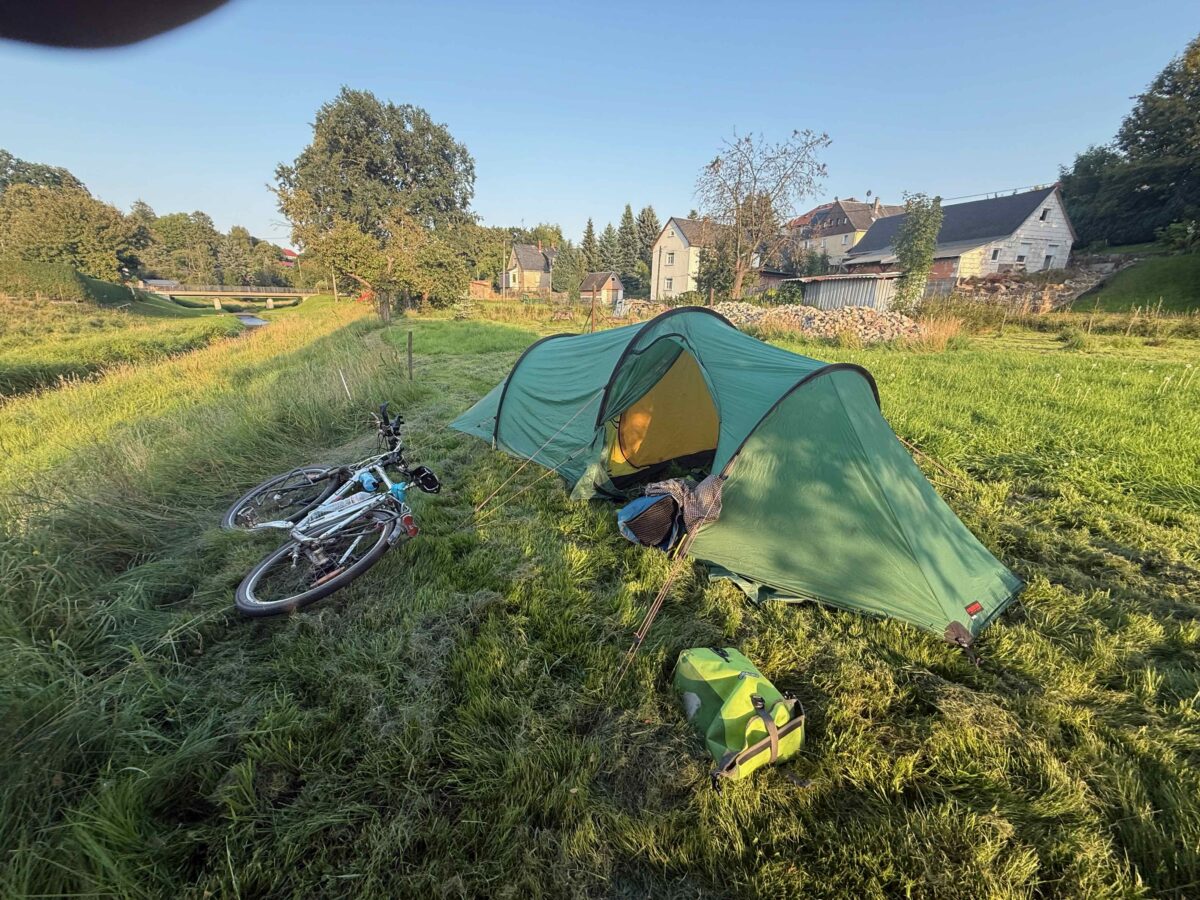 Am Spätmittag suchte ich dann schon den Campingplatz den ich mir ausgesucht hatte. Ich musste dann erkennen das Campingplätze nicht nur spärlich gesäht sind, auf dieser Strecke, sie existieren einfach nicht! So war der Platz dann eben eine Wiese, die ein Bauer fürs Zelt aufschlagen eröffnet hatte, genau weil es eben keine Campingplätze gab! Für eine Nacht war es genug und mit dem Bach an der Seite und den Schafen gegenüber sehr Idyllisch. Auch war ein Netto in Fussnähe der noch geöffnet hatte, so war alles gut! Nur Strom war nicht und so musste die Arbeit am Nachmittag dann vom Akku aus laufen – gemütlich an nem vollen Tisch im Schatten eines Baumes, voll mit Nahrungsmitteln und Entspannung.